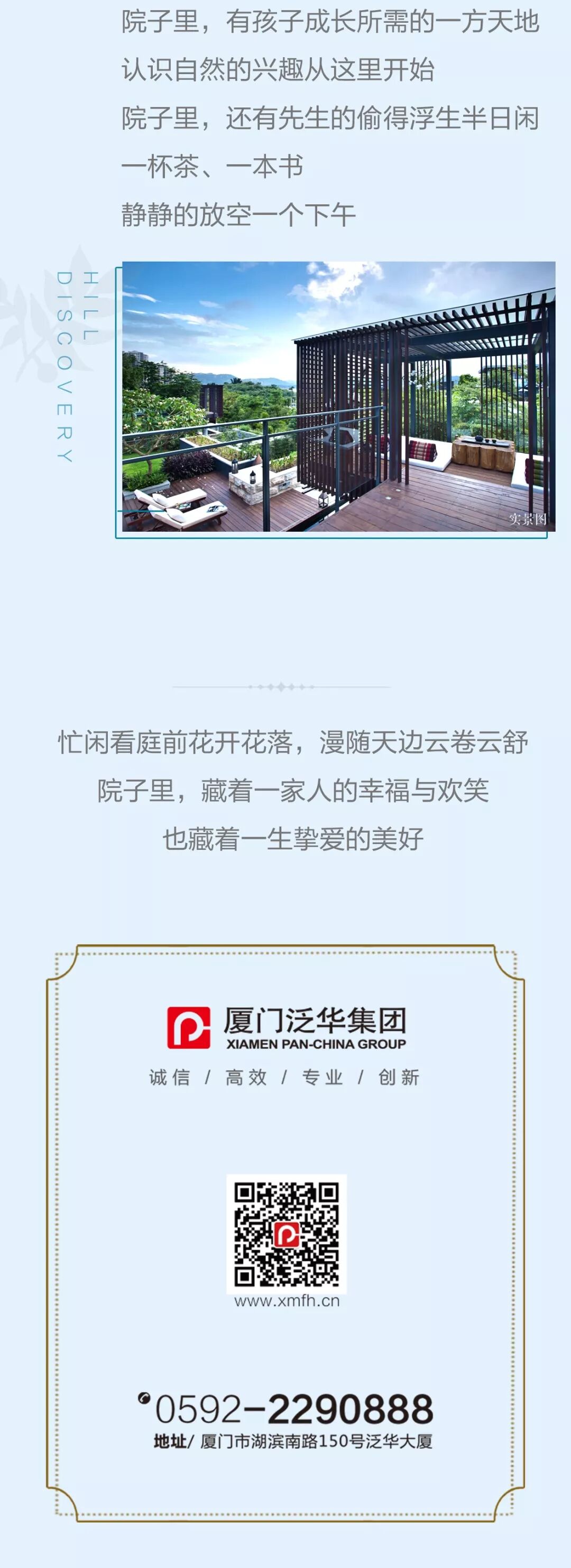 发现之旅位于厦门西·长泰马洋溪旅游度假区。项目主要围绕四大生态主题:生态住宅、生态旅游、生态文化、生态农业。发现之旅天印园背靠天成山文化旅游景区,紧临湿地湖。产品以独栋、联排、叠加三种别墅类型组成,全封闭·半岛纯别墅社区。