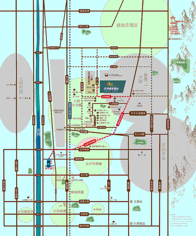 泛华盛世阳光,雄踞北城高地,这里承载着太原人一脉相承的人居情结,更期待新生代居住区的拔地而起! 泛华盛世阳光项目总占地约133亩,一期总建面约16万平米,以6栋现代风格阳光美宅,近10000㎡中庭绿化园林,开启北城全新现代生活。建面约87-125㎡阳光美宅,层高3米,经典设计,南北三阳台,大面宽朝南客厅,全家人的幸福之选。 未来,小区建成后,从约6米高小区大门到多重禅意景观、休闲运动场地,从精装单元入户大堂到地下车库入户门厅,尊享双重归家礼遇,从智能人车分流管理到星级物管服务,泛华盛世阳光将为业主打造全方位美好生活! 经典户型 品鉴阳光健康生活 经典户型设计,温馨婚房首选! 建面约87㎡阳光两房,为甜蜜爱情保鲜! 用阳光装满房间,让幸福常驻家中! 建面约125㎡阳光三房,美好生活一步到位! ●项目地址● 山西省太原市杏花岭区 七府园路北辰双语学校东侧 ●展示地址● 泛华城市展厅: 胜利街与金刚堰路西南角 热线:0351-8853333 温馨提示: 1. 本资料仅为要约邀请,不作为要约或承诺;2. 相关宣传内容不排除因政府相关规划、规定及发布人分期规划、未能控制等原因而发生变化;3. 发布人可能会不定期对宣传材料进行修改,不再另行通知;4. 本资料所发布的内容为2020年10月31日前的信息;5.本广告所涉及的图文资料均来源于网络,仅供参考,如若侵犯肖像权,请联系我方删除,来源于网络的图片,如有侵权也请及时联系我方删除。